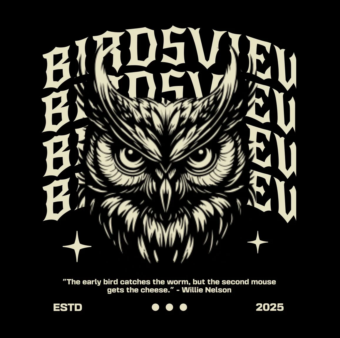 Unleash your inner wisdom with our Birdsview T-shirt! Featuring the iconic "Birdsview" elegantly styled in old English font, this shirt is perfect for bird enthusiasts and owl lovers alike. Paired with a striking illustration of a wise owl, this tee captures the essence of nature’s inquisitive spirit.